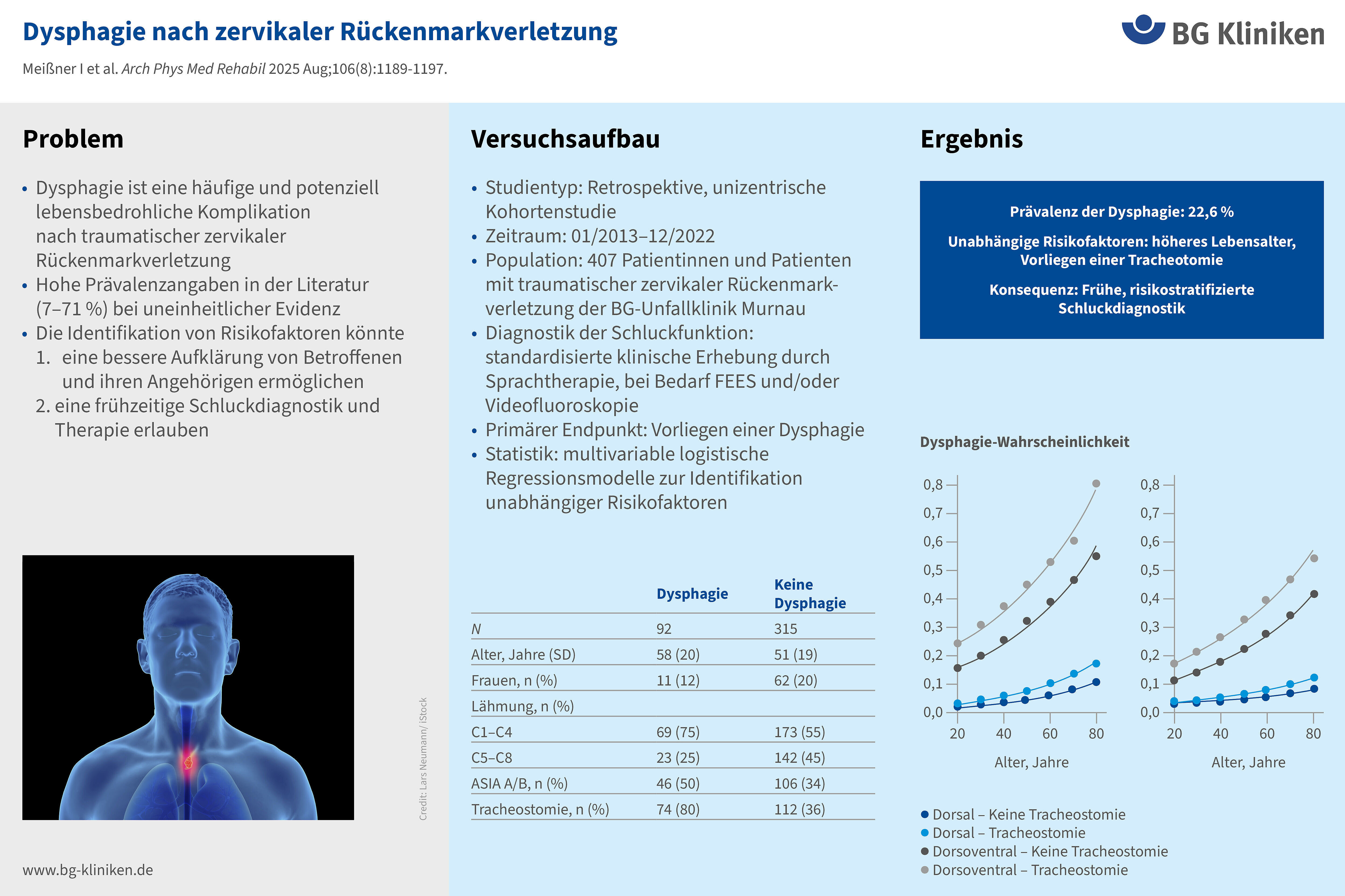 Gleichzeitig sprechen die Beobachtungen gegen eine pauschale Annahme eines erhöhten Dysphagierisikos allein aufgrund des operativen Zugangs und unterstreichen die Bedeutung interdisziplinärer Versorgungsstrukturen zwischen Intensivmedizin, Unfallchirurgie, Querschnittzentren und Sprachtherapie. Unverändert besteht der Bedarf an validen Screening- und Assessment-Instrumenten im betrachteten Szenario.