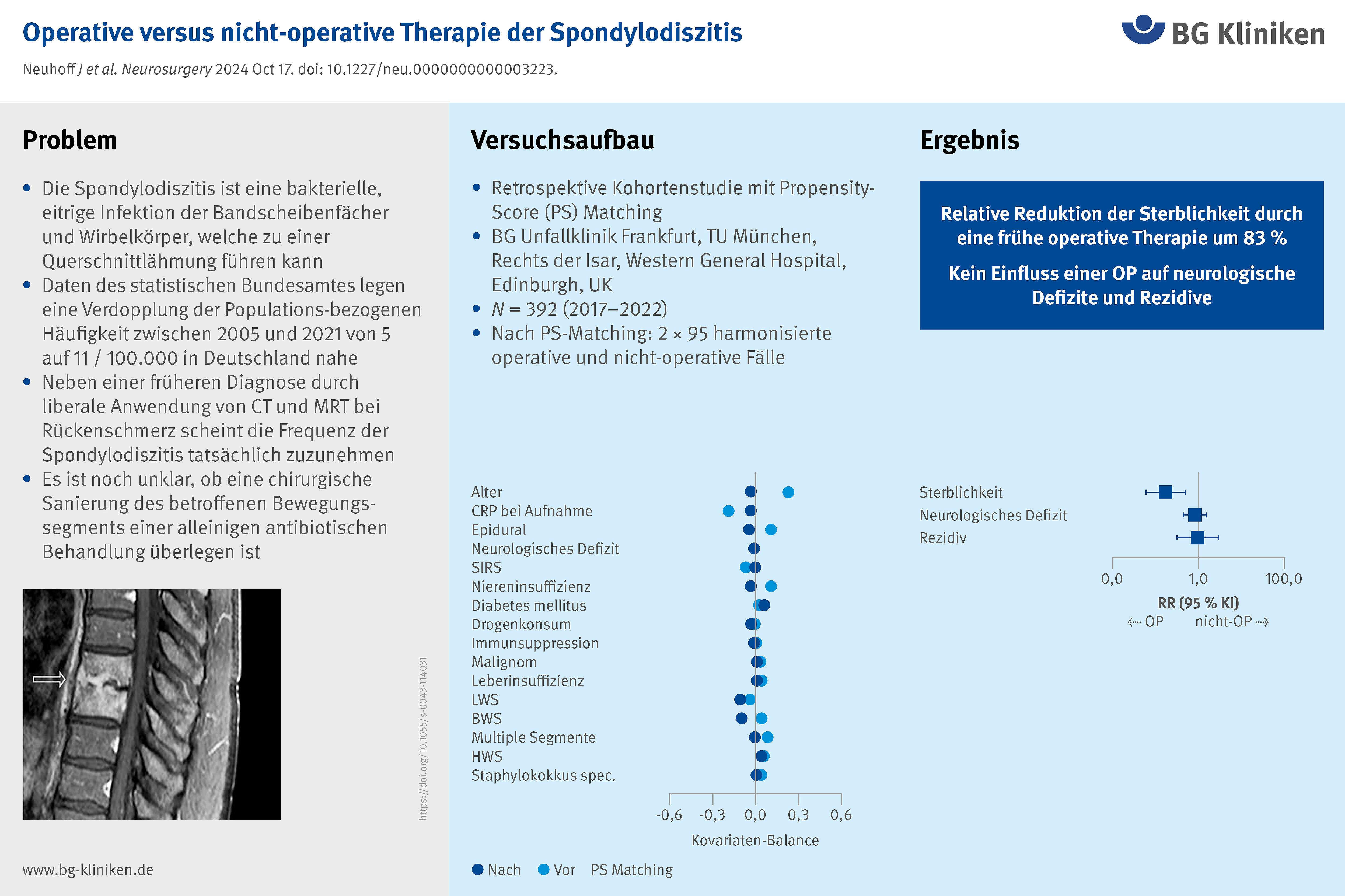 Es existieren unverändert unzureichende klinisch-wissenschaftliche Informationen aus einem direkten Vergleich einer primär operativen mit einer nicht-operativen Strategie zur Behandlung einer Spondylodiszitis im Hinblick auf Patienten-relevante Endpunkte.