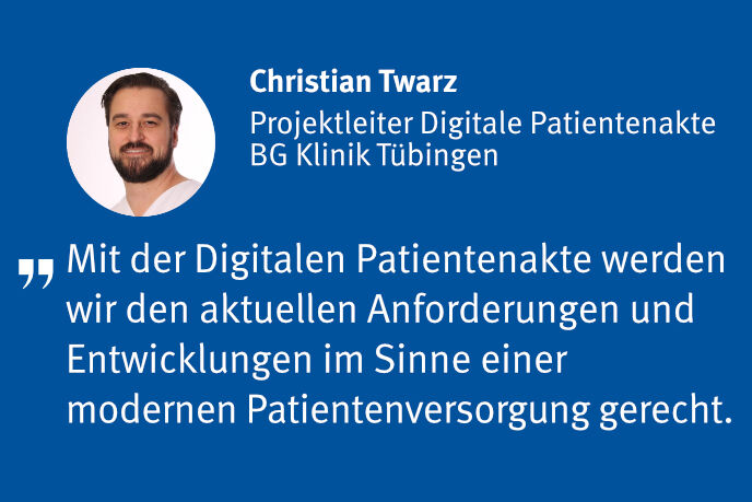 Mit Einführung der digitalen Patientenakte an der BG Klinik Tübingen wurde die Papierakte vollständig ersetzt. Als Grundlage für modernes Arbeiten in Kliniken ermöglicht die elektronische Dokumentation von Pflege- und Behandlungsleistungen ein noch effizienteres und transparenteres Arbeiten im Klinikalltag.