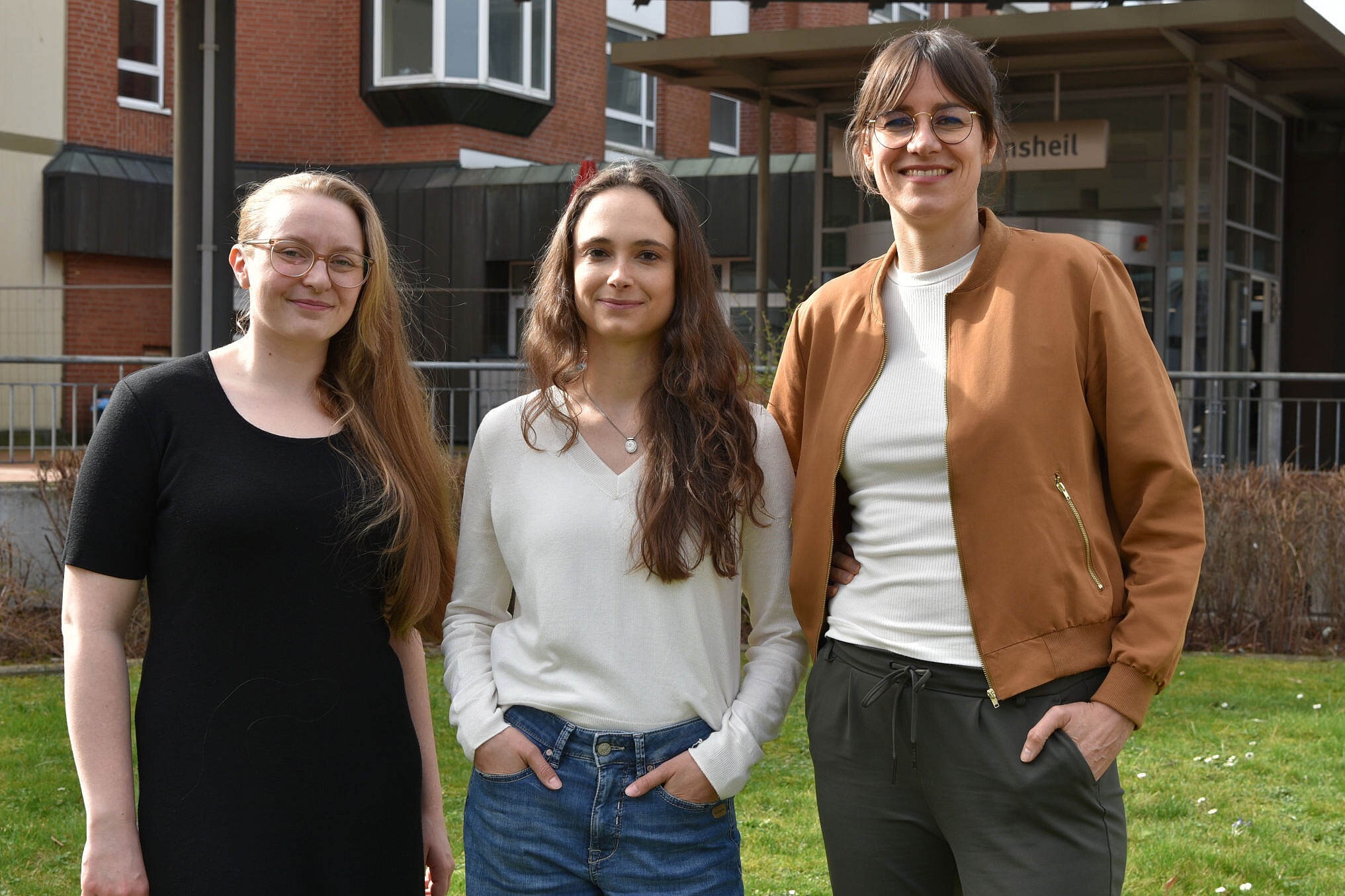Bild: Klimaschutzmanagerin Lea Pattberg (Mitte) mit den Nachhaltigkeitsmanagerinnen Marie Riedesel (links) und Manon Wicking (rechts). Gemeinsam entwickeln sie ein Klimaschutzkonzept für das Bergmannsheil. Bildnachweis: Bergmannsheil