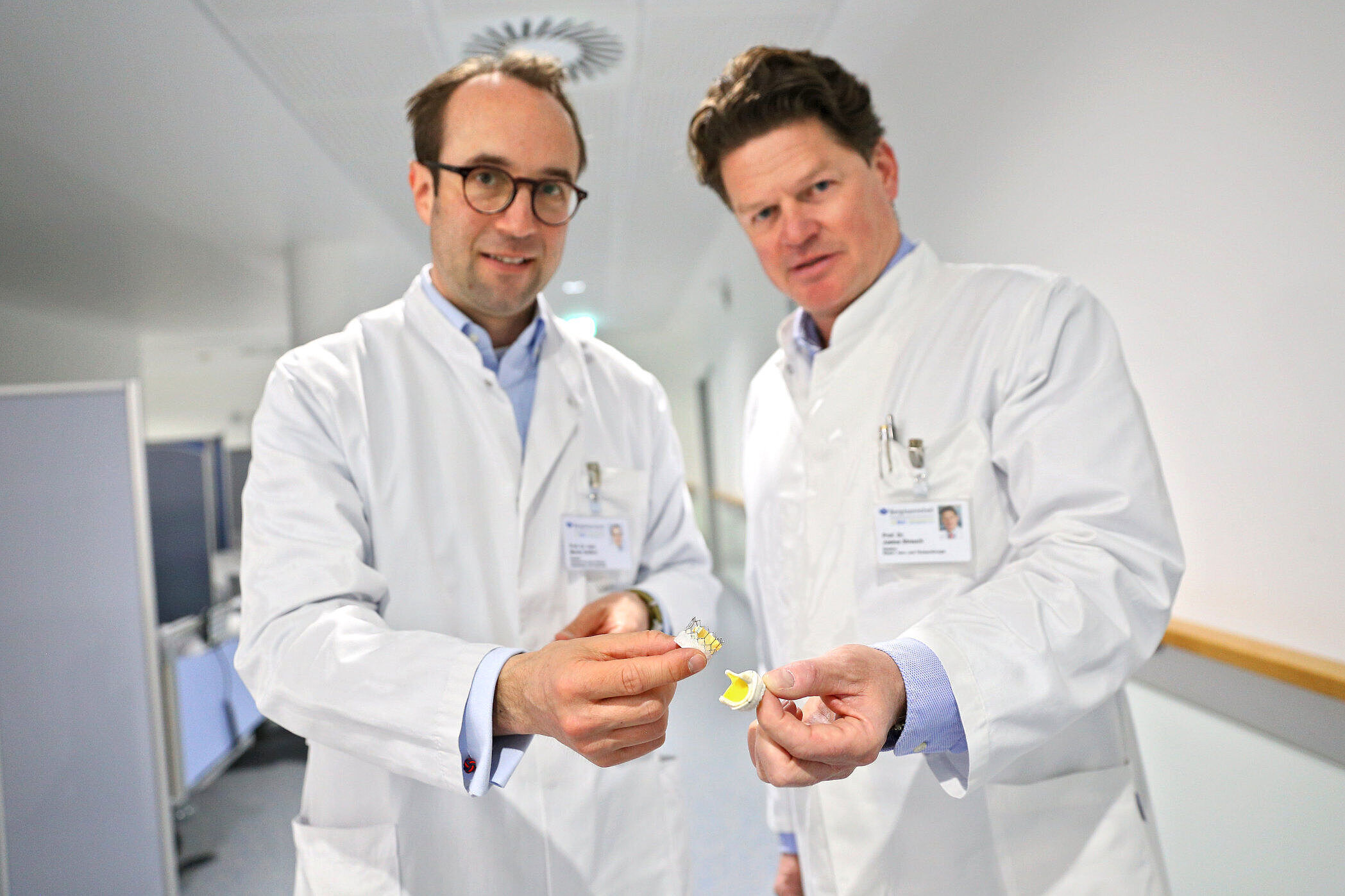 Bild: Prof. Dr. Moritz Seiffert (Kardiologie, links) und Prof. Dr. Justus Strauch (Herz- und Thoraxchirurgie) zeigen künstliche Herzklappenmodelle. Bildnachweis: D. Pfennigwerth / Bergmannsheil