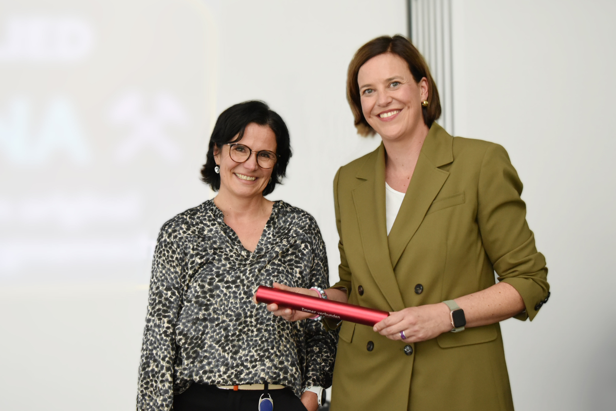 Bild: Symbolische Staffelstabübergabe: Dr. Tina Groll (links) scheidet als Vorsitzende der Geschäftsführung aus dem Bergmannsheil aus, Anne Elvering (rechts) ist künftig alleinige Geschäftsführerin der Klinik.