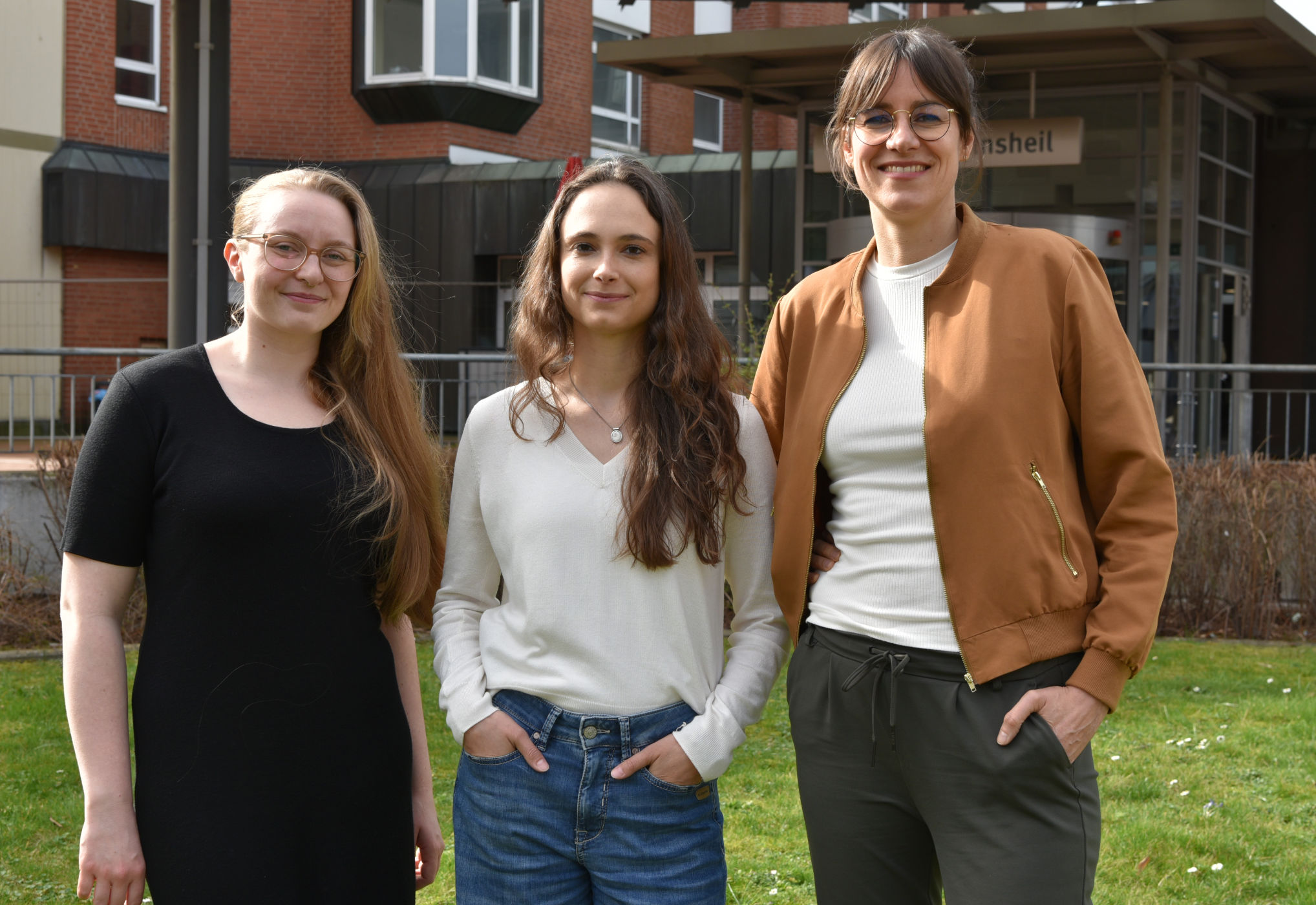 Bild: Klimaschutzmanagerin Lea Pattberg (Mitte) mit den Nachhaltigkeitsmanagerinnen Marie Riedesel (links) und Manon Wicking (rechts). Gemeinsam entwickeln sie ein Klimaschutzkonzept für das Bergmannsheil. Bildnachweis: Bergmannsheil